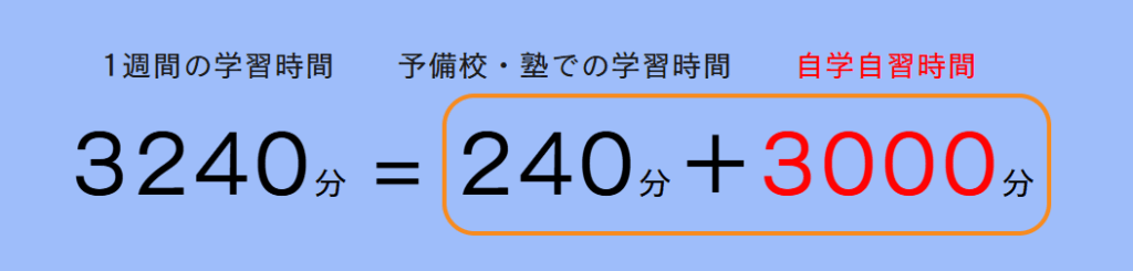 予備校や塾での授業時間は1週間に240分ほどしかないのに対し、自学自習の時間は3000分と圧倒的に多くを占めています。